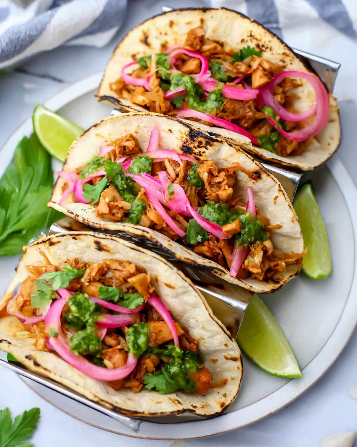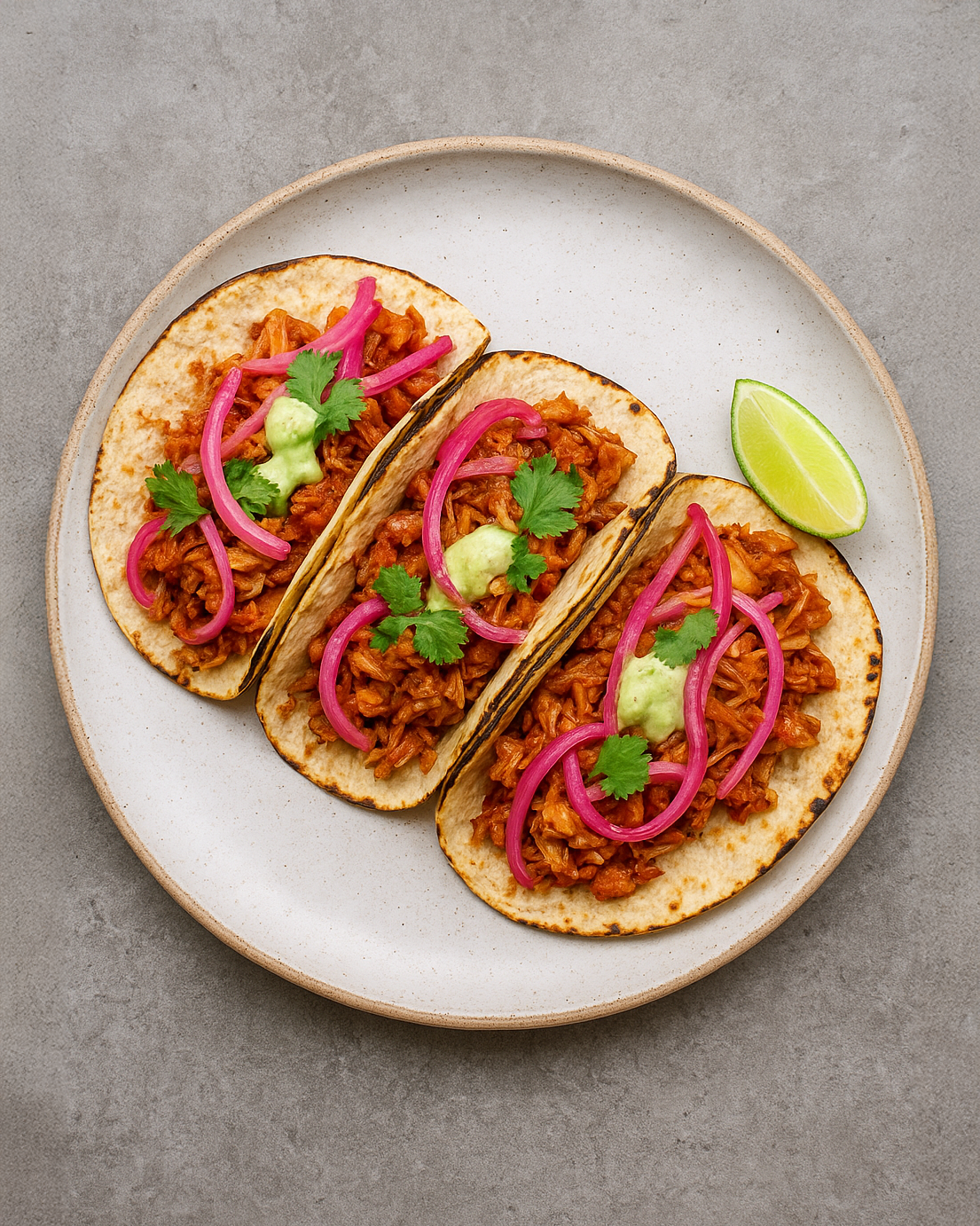 These tacos bring the fiesta — smoky, juicy, and unapologetically bold. Every bite hits that perfect balance of sweet BBQ, creamy queso, and zingy crunch. You’d swear it’s pulled pork… but your conscience knows better. 😏🌱