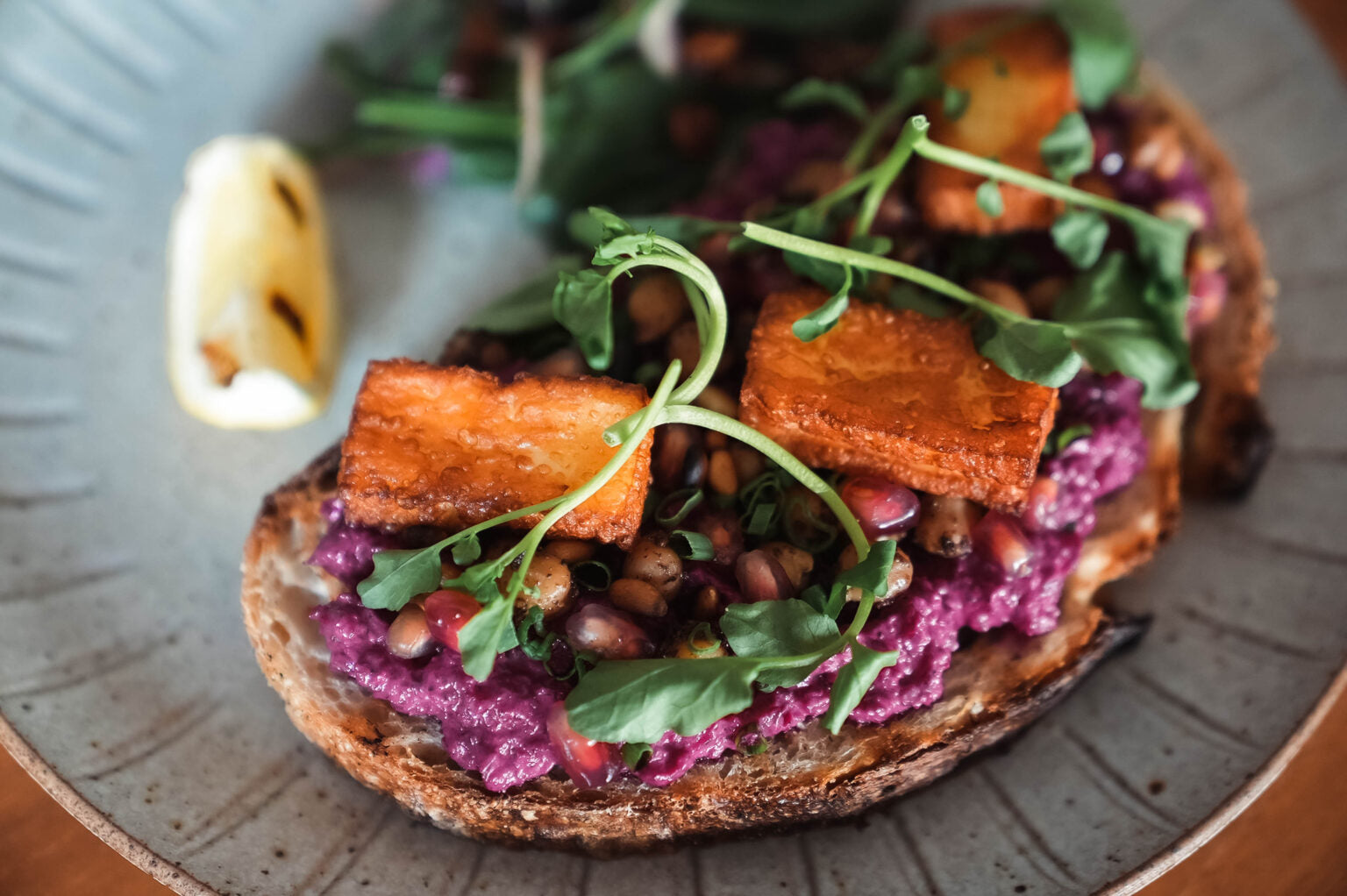 Beet hummus, spiced chickpeas, pomegranate, and grilled halloumi served on artisan sourdough bread.