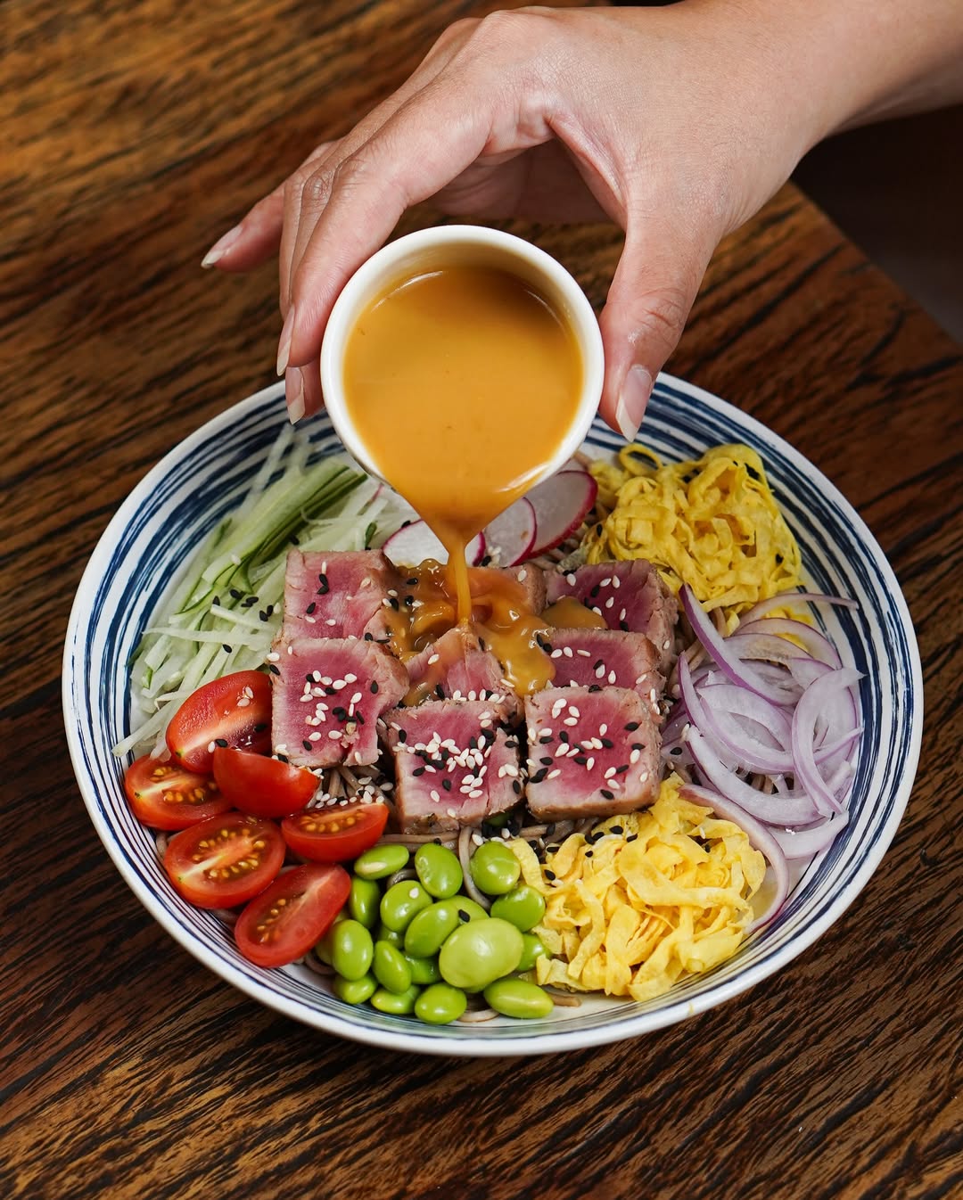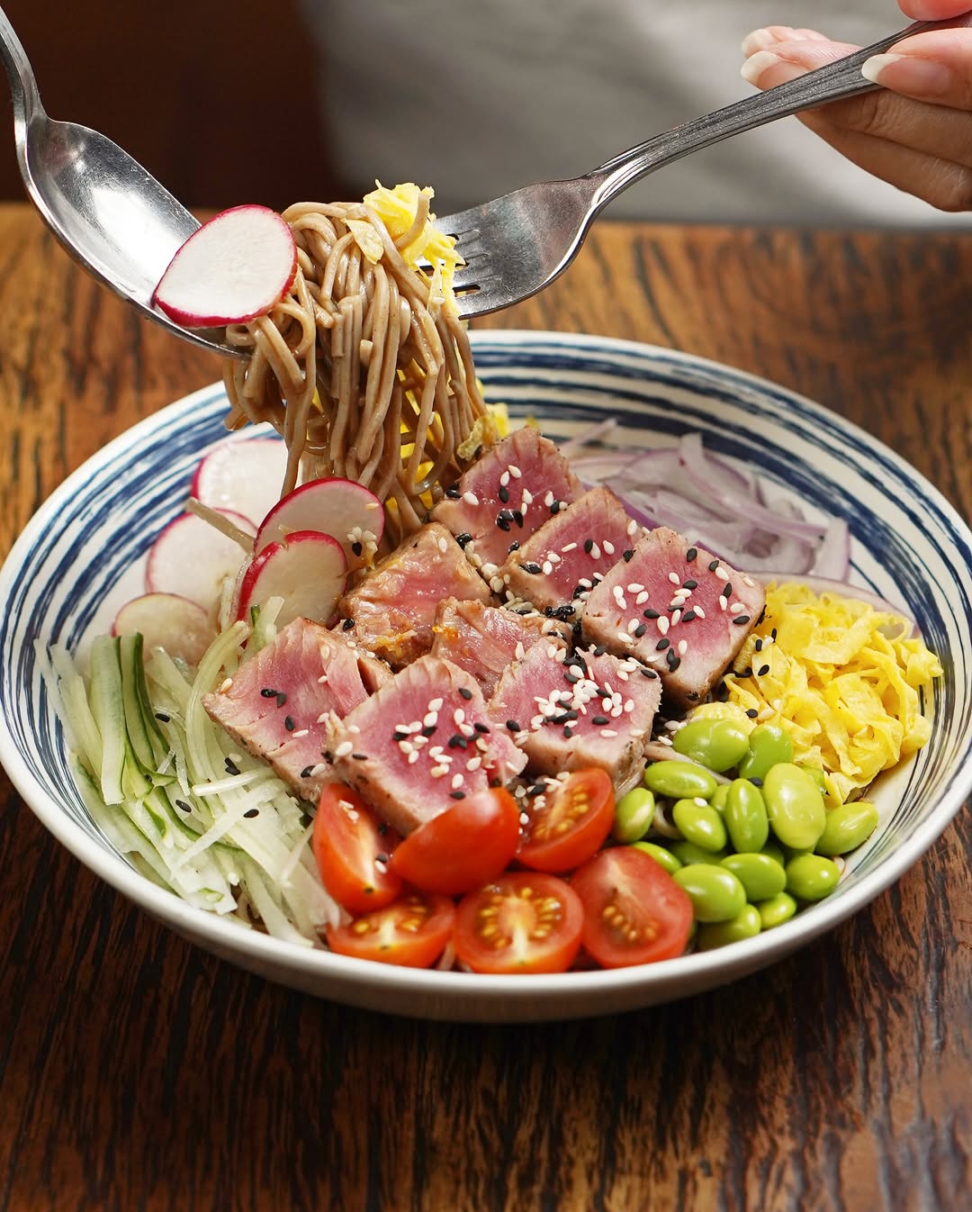 Seared tuna on chilled soba noodles with cucumber, edamame, radish, cherry tomatoes, red onion, and fine egg ribbons — served with our refreshing house yuzu dressing.