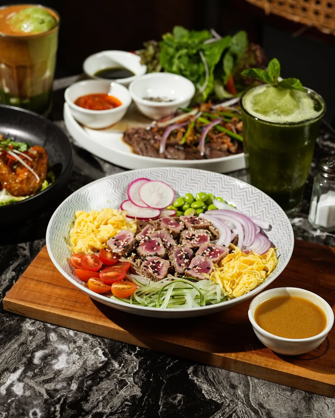 A light and balanced bowl that brings together clean Japanese flavors and Bali freshness. The citrusy yuzu cuts through the tender tuna, while crisp vegetables and soba add the perfect earthy harmony.